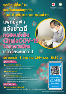 ขอเชิญผู้ที่สนใจร่วมรับชมการแถลงความคืบหน้าล่าสุดของการวิจัยและพัฒนา ChulaCov19 Vaccine ผ่านทาง Facebook Live | Fan Page โรงพยาบาลจุฬาลงกรณ์ สภากาชาดไทย https://www.facebook.com/ChulalongkornHospital/... Read More