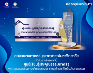 คณะแพทยศาสตร์ จุฬาลงกรณ์มหาวิทยาลัย ได้รับการรับรองเป็นศูนย์เรียนรู้เชิงคุณธรรมภาครัฐ จากศูนย์คุณธรรม (องค์การมหาชน) และองค์กรภาคีเครือข่ายคุณธรรม Posted on03 ต.ค. 2025Tags#mdcu, chula, chulalongkorn, medicine, คณะแพทยศาสตร์จุฬาลงกรณ์มหาวิทยาลัย, คณะแพทยศาสตร์จุฬาฯ, คณะแพทย์จุฬาฯ, เกียรติภูมิแพทย์จุฬาฯ, แพทย์จุฬาฯ