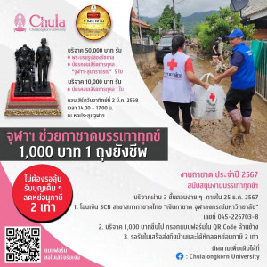 ในโอกาสงานกาชาด ปี 2567 จุฬาลงกรณ์มหาวิทยาลัยขอเชิญชวนร่วมบริจาคเงินเพื่อสภากาชาดไทย สนับสนุนงานบรรเทาทุกข์ สำนักงานบรรเทาทุกข์และประชานามัยพิทักษ์ สภากาชาดไทย Posted on20 มี.ค. 2025Tags#mdcu, chula, chulalongkorn, medicine, คณะแพทยศาสตร์จุฬาลงกรณ์มหาวิทยาลัย, คณะแพทยศาสตร์จุฬาฯ, คณะแพทย์จุฬาฯ, แพทย์จุฬาฯ ไม่ต้องรอลุ้น รับบุญเต็มๆ ลดหย่อนภาษี 2 เท่า ร่วมบริจาคผ่าน 3 ขั้นตอนง่าย ๆ ภายใน 25 ธันวาคม 2567 โอนเงินเข้าบัญชีธนาคารไทยพาณิชย์ (SCB) สาขาสภากาชาดไทย ชื่อบัญชี “เงินกาชาด จุฬาลงกรณ์มหาวิทยาลัย” เลข... Read More