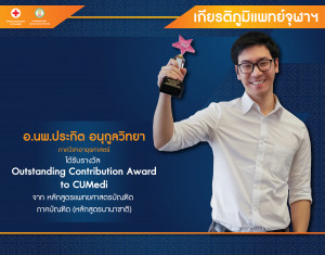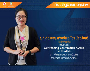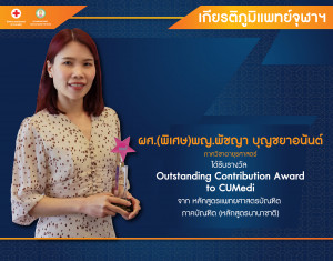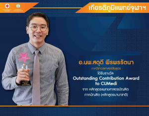 อ.นพ.สดุดี พีรพรรัตนา ภาควิชาเวชศาสตร์ชันสูตร ได้รับรางวัล Outstanding Contribution Award to CUMedi (เกียรติภูมิแพทย์จุฬาฯ) Posted on11 ก.ค. 2024Tags#mdcu, chula, chulalongkorn, medicine, คณะแพทยศาสตร์จุฬาลงกรณ์มหาวิทยาลัย, คณะแพทยศาสตร์จุฬาฯ, คณะแพทย์จุฬาฯ, เกียรติภูมิแพทย์จุฬาฯ, แพทย์จุฬาฯ
