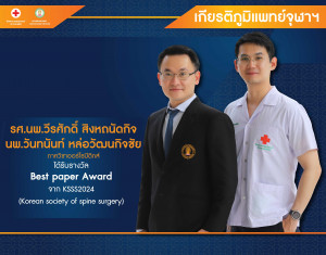รศ.นพ.วีรศักดิ์ สิงหถนัดกิจ นพ.วันทนันท์ หล่อวัฒนกิจชัย ภาควิชาออร์โธปิดิกส์ ได้รับรางวัล Best paper Award จาก KSSS2024 (Korean society of spine surgery) (เกียรติภูมิแพทย์จุฬาฯ) Posted on11 ก.ค. 2024Tags#mdcu, chula, chulalongkorn, medicine, คณะแพทยศาสตร์จุฬาลงกรณ์มหาวิทยาลัย, คณะแพทยศาสตร์จุฬาฯ, คณะแพทย์จุฬาฯ, เกียรติภูมิแพทย์จุฬาฯ, แพทย์จุฬาฯ
