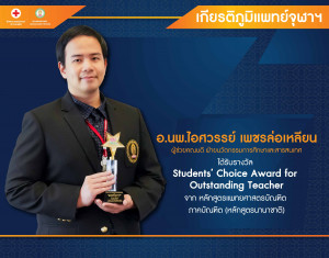 อ.นพ.ไอศวรรย์ เพชรล่อเหลียน ผู้ช่วยคณบดี ฝ่ายนวัตกรรมการศึกษาและสารสนเทศ ได้รับรางวัล Students’ Choice Award for Outstanding Teacher (เกียรติภูมิแพทย์จุฬาฯ) Posted on11 ก.ค. 2024Tags#mdcu, chula, chulalongkorn, medicine, คณะแพทยศาสตร์จุฬาลงกรณ์มหาวิทยาลัย, คณะแพทยศาสตร์จุฬาฯ, คณะแพทย์จุฬาฯ, เกียรติภูมิแพทย์จุฬาฯ, แพทย์จุฬาฯ