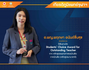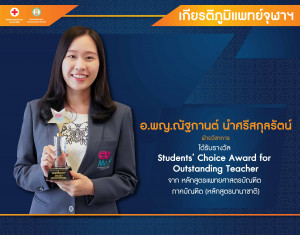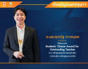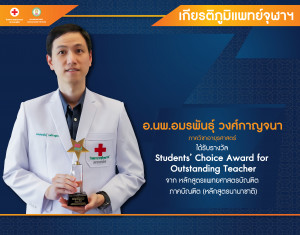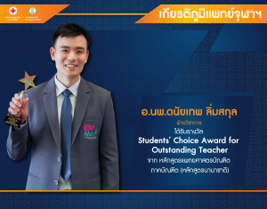 อ.นพ.ศุภณัฐ ถาวรบุตร ฝ่ายวิชาการ ได้รับรางวัล Students’ Choice Award for Outstanding Teacher (เกียรติภูมิแพทย์จุฬาฯ) Posted on03 ก.ค. 2024Tags#mdcu, chula, chulalongkorn, cumedi, medicine, คณะแพทยศาสตร์จุฬาลงกรณ์มหาวิทยาลัย, คณะแพทยศาสตร์จุฬาฯ, คณะแพทย์จุฬาฯ, แพทย์จุฬานานาชาติ, แพทย์จุฬาฯ