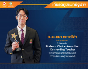 อ.นพ.ธนา ทองศรีคำ ภาควิชาสรีรวิทยา ได้รับรางวัล Students’ Choice Award for Outstanding Teacher (เกียรติภูมิแพทย์จุฬาฯ) Posted on03 ก.ค. 2024Tags#mdcu, chula, chulalongkorn, cumedi, medicine, คณะแพทยศาสตร์จุฬาลงกรณ์มหาวิทยาลัย, คณะแพทยศาสตร์จุฬาฯ, คณะแพทย์จุฬาฯ, แพทย์จุฬานานาชาติ, แพทย์จุฬาฯ