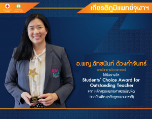 อ.พญ.ฉัทชนันท์ ด้วงคำจันทร์ ภาควิชากายวิภาคศาสตร์ ได้รับรางวัล Students’ Choice Award for Outstanding Teacher (เกียรติภูมิแพทย์จุฬาฯ) Posted on03 ก.ค. 2024Tags#mdcu, chula, chulalongkorn, cumedi, medicine, คณะแพทยศาสตร์จุฬาลงกรณ์มหาวิทยาลัย, คณะแพทยศาสตร์จุฬาฯ, คณะแพทย์จุฬาฯ, แพทย์จุฬานานาชาติ, แพทย์จุฬาฯ