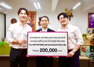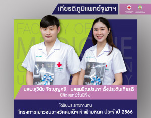 นสพ.สุวินัย จิระบุญศรี และ นสพ.พีณประภา ตั้งประดับเกียรติ นิสิตแพทย์ ชั้นปีที่ 6 ได้รับพระราชทานทุนโครงการเยาวชนรางวัลสมเด็จเจ้าฟ้ามหิดล ประจำปี 2566 (เกียรติภูมิแพทย์จุฬาฯ) Posted on19 ธ.ค. 2023Tags#mdcu, chula, chulalongkorn, medicine, คณะแพทยศาสตร์จุฬาลงกรณ์มหาวิทยาลัย, คณะแพทยศาสตร์จุฬาฯ, คณะแพทย์จุฬาฯ, เกียรติภูมิแพทย์จุฬาฯ, แพทย์จุฬาฯ
