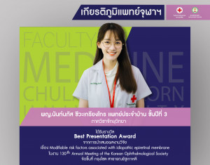 พญ.นันท์นภัส ชีวะเกรียงไกร แพทย์ประจำบ้าน ชั้นปีที่ 3 ภาควิชาจักษุวิทยา ได้รับรางวัล Best Presentation Award (เกียรติภูมิแพทย์จุฬาฯ) Posted on27 ธ.ค. 2023Tags#mdcu, chula, chulalongkorn, medicine, คณะแพทยศาสตร์จุฬาลงกรณ์มหาวิทยาลัย, คณะแพทยศาสตร์จุฬาฯ, คณะแพทย์จุฬาฯ, เกียรติภูมิแพทย์จุฬาฯ, แพทย์จุฬาฯ