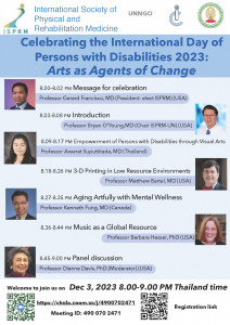 Celebrating the International Day of Persons with Disabilities 2023: Arts as Agents of Change Posted on29 พ.ย. 2023Tags#mdcu, chula, Chulafordisabilityreduction, chulalongkorn, ISPRM, medicine, คณะแพทยศาสตร์จุฬาลงกรณ์มหาวิทยาลัย, คณะแพทยศาสตร์จุฬาฯ, คณะแพทย์จุฬาฯ, แพทย์จุฬาฯ 🎉เชิญร่วมฉลองวันคนพิการสากลปี 2566 นี้ ด้วยการนำ 🎨ศิลปะที่หลากหลาย การพิมพ์ 3 มิติและดนตรี 🎶นำมาฟื้นฟูผู้ป่วย เพื่อให้มีความพิการน้อยลง เป็นการสนับสนุน UN SDG 2030 ขององค์การสห... Read More