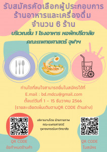 ประกาศรับสมัครผู้ประกอบการร้านอาหารและเครื่องดื่ม ณ โรงอาหาร ชั้น 1 หอพักปรีดาลัย คณะแพทยศาสตร์ จุฬาฯ Posted on04 ธ.ค. 2023Tags#mdcu, chula, chulalongkorn, medicine, คณะแพทยศาสตร์จุฬาลงกรณ์มหาวิทยาลัย, คณะแพทยศาสตร์จุฬาฯ, คณะแพทย์จุฬาฯ, แพทย์จุฬาฯ ประกาศรับสมัครผู้ประกอบการร้านอาหารและเครื่องดื่ม ณ โรงอาหาร ชั้น 1 หอพักปรีดาลัย คณะแพทยศาสตร์ จุฬาฯ ช่องทางการส่งใบสมัคร E-mail: bd.mdcu@gmail.com (ช่องทางเดียวเท่านั้น) ดาวน์โหลดใบสมัคร และข้อกำหนด... Read More
