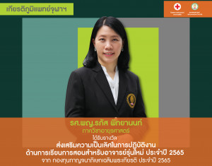 รศ.พญ.รภัส พิทยานนท์ ภาควิชาอายุรศาสตร์ ได้รับรางวัล ส่งเสริมความเป็นเลิศในการปฏิบัติงาน ด้านการเรียนการสอนสำหรับอาจารย์รุ่นใหม่ ประจำปี 2565 จาก กองทุนกาญจนาภิเษกเฉลิมพระเกียรติ ประจำปี 2565 (เกียรติภูมิแพทย์จุฬาฯ) Posted on07 ก.ย. 2023Tags#mdcu, chula, chulalongkorn, medicine, คณะแพทยศาสตร์จุฬาลงกรณ์มหาวิทยาลัย, คณะแพทยศาสตร์จุฬาฯ, คณะแพทย์จุฬาฯ, เกียรติภูมิแพทย์จุฬาฯ, แพทย์จุฬาฯ