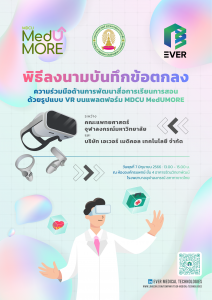 พิธีลงนามบันทึกข้อตกลง ความร่วมมือด้านการพัฒนาสื่อสารการเรียนการสอน ระหว่าง คณะแพทยศาสตร์ จุฬาลงกรณ์มหาวิทยาลัย และ บริษัท เอเวอร์ เมดิคอล เทคโนโลยี จำกัด Posted on06 มิ.ย. 2023Tags#mdcu, chula, chulalongkorn, CU, medicine, MedUMore, คณะแพทยศาสตร์จุฬาลงกรณ์มหาวิทยาลัย, คณะแพทยศาสตร์จุฬาฯ, คณะแพทย์จุฬาฯ, ความรู้แพทย์, คอร์สเรียนออนไลน์, อีเลิร์นนิงทางการแพทย์, เรียนออนไลน์แพทย์, แพทย์จุฬาฯ