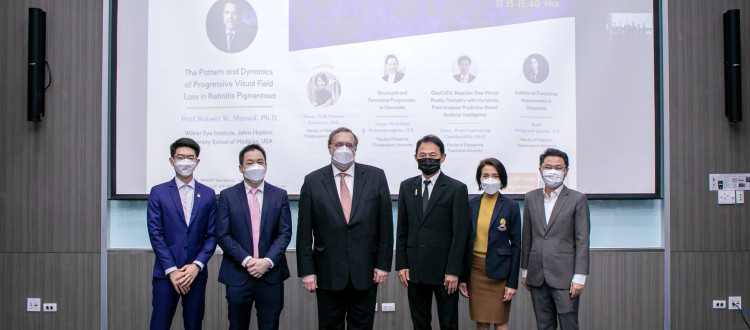รศ.นพ.ฉันชาย สิทธิพันธุ์ คณบดี คณะแพทยศาสตร์ จุฬาลงกรณ์มหาวิทยาลัย กล่าวต้อนรับ Prof. Robert W. Massof, Ph.D., Wilmer Eye Institute, Johns Hopkins University School of Medicine สหรัฐอเมริกา เนื่องในโอกาสมาเป็นวิทยากรในการบรรยายพิเศษ Prince Mahidol Award Youth Program (PMAYP) Conference 2021-2022 เรื่อง The Pattern and Dynamics of Progressive Visual Field Loss in Retinitis Pigmentosa โดยมี รศ.นพ.ปริญญ์ โรจนพงศ์พันธุ์ อาจารย์ประจำภาควิชาจักษุวิทยา คณะแพทยศาสตร์ จุฬาลงกรณ์มหาวิทยาลัย พร้อมด้วย รศ.ดร.จาตุรงค์ ตันติบัณฑิต อาจารย์ประจำภาควิชาวิศวกรรมไฟฟ้าและคอมพิวเตอร์ คณะวิศวกรรมศาสตร์ มหาวิทยาลัยธรรมศาสตร์ อ.นพ.รัฐ อิทธิพานิชพงศ์ อาจารย์ประจำภาควิชาจักษุวิทยา คณะแพทยศาสตร์ จุฬาลงกรณ์มหาวิทยาลัย เป็นวิทยากรร่วมการบรรยาย ซึ่ง รศ.พญ.วิศนี ตันติเสวี อาจารย์ประจำภาควิชาจักษุวิทยา คณะแพทยศาสตร์ จุฬาลงกรณ์มหาวิทยาลัย เป็นผู้ดำเนินรายการ ณ ห้อง 301 ชั้น 3 อาคารรัตนวิทยาพัฒน์ โรงพยาบาลจุฬาลงกรณ์ สภากาชาดไทย และผ่านแอปพลิเคชัน Zoom Cloud Meeting