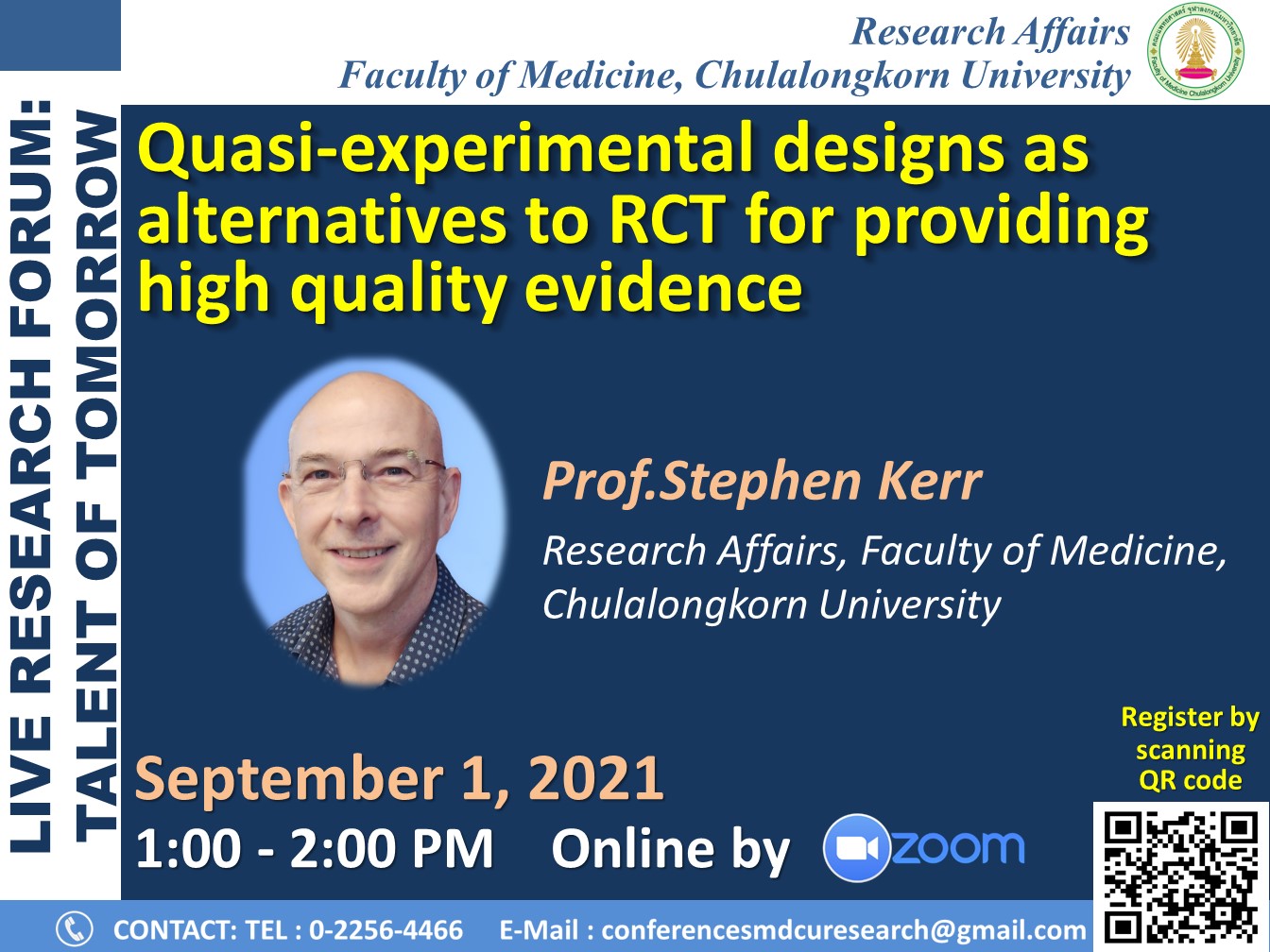 13 ส.ค. 2021 Quasi-experimental designs as alternatives to RCT for providing high quality evidence /Tags#mdcu, chula, chulalongkorn, medicine, คณะแพทยศาสตร์จุฬาลงกรณ์มหาวิทยาลัย, คณะแพทยศาสตร์จุฬาฯ, คณะแพทย์จุฬาฯ, แพทย์จุฬาฯ กลับไปหน้าข่าวประชาสัมพันธ์