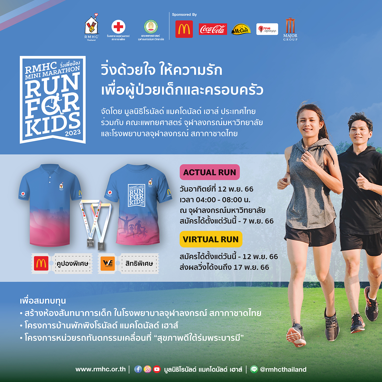 27 ก.ย. 2023 RMHC Mini Marathon Run For Kids วิ่งเพื่อน้อง 2023 “วิ่งด้วยใจ ให้ความรัก เพื่อผู้ป่วยเด็กและครอบครัว” /Tags#mdcu, chula, chulalongkorn, medicine, คณะแพทยศาสตร์จุฬาลงกรณ์มหาวิทยาลัย, คณะแพทยศาสตร์จุฬาฯ, คณะแพทย์จุฬาฯ, แพทย์จุฬาฯ กลับไปหน้าข่าวประชาสัมพันธ์