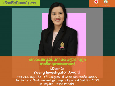 ผศ.ดร.พญ.ชนนิกานต์ วิสูตรานุกูล ภาควิชากุมารเวชศาสตร์ ได้รับรางวัล Young Investigator Award จาก งานประชุม The 16 Congress of Asian-Pan Pacific Society for Pediatric Gastroenterology, Hepatology and Nutrition 2023 ณ กรุงโซล ประเทศเกาหลีใต้ (เกียรติภูมิแพทย์จุฬาฯ) Posted on12 ต.ค. 2023Tags#mdcu, chula, chulalongkorn, medicine, คณะแพทยศาสตร์จุฬาลงกรณ์มหาวิทยาลัย, คณะแพทยศาสตร์จุฬาฯ, คณะแพทย์จุฬาฯ, เกียรติภูมิแพทย์จุฬาฯ, แพทย์จุฬาฯ