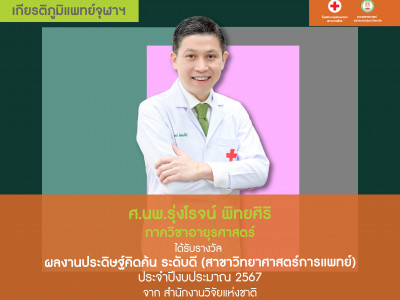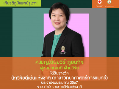 ศ.พญ.ธันยวีร์ ภูธนกิจ ผู้ช่วยคณบดี ฝ่ายวิจัย ได้รับรางวัลนักวิจัยดีเด่นแห่งชาติ (สาขาวิทยาศาสตร์การแพทย์) ประจำปีงบประมาณ 2567 จาก สำนักงานการวิจัยแห่งชาติ (เกียรติภูมิแพทย์จุฬาฯ) Posted on12 ต.ค. 2023Tags#mdcu, chula, chulalongkorn, medicine, คณะแพทยศาสตร์จุฬาลงกรณ์มหาวิทยาลัย, คณะแพทยศาสตร์จุฬาฯ, คณะแพทย์จุฬาฯ, เกียรติภูมิแพทย์จุฬาฯ, แพทย์จุฬาฯ