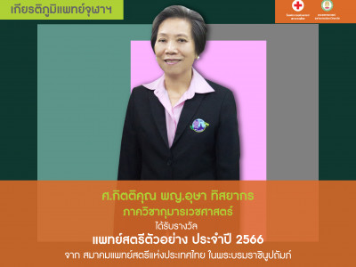 รศ.พญ.คุณหญิงวรรณา สมบูรณ์วิบูลย์ ภาควิชาวิสัญญีวิทยา ได้รับรางวัลแพทย์สตรีตัวอย่าง ประจำปี 2566 จากสมาคมแพทย์สตรีแห่งประเทศไทย ในพระบรมราชินูปถัมภ์ (เกียรติภูมิแพทย์จุฬาฯ) Posted on18 ต.ค. 2023Tags#mdcu, chula, chulalongkorn, medicine, คณะแพทยศาสตร์จุฬาลงกรณ์มหาวิทยาลัย, คณะแพทยศาสตร์จุฬาฯ, คณะแพทย์จุฬาฯ, เกียรติภูมิแพทย์จุฬาฯ, แพทย์จุฬาฯ