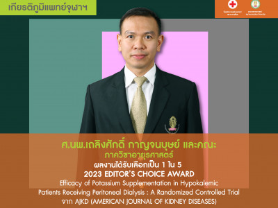 ศ.นพ.เถลิงศักดิ์ กาญจนบุษย์ และคณะ ภาควิชาอายุรศาสตร์ ผลงานได้รับเลือกเป็น 1 ใน 5 2023 EDITOR’S CHOICE AWARD Efficacy of Potassium Supplementation in Hypokalemic Patients Receiving Peritoneal Dialysis : A Randomized Controlled Trial จาก AJKD (AMERICAN JOURNAL OF KIDNEY DISEASES) – (เกียรติภูมิแพทย์จุฬาฯ) Posted on12 ต.ค. 2023Tags#mdcu, chula, chulalongkorn, medicine, คณะแพทยศาสตร์จุฬาลงกรณ์มหาวิทยาลัย, คณะแพทยศาสตร์จุฬาฯ, คณะแพทย์จุฬาฯ, เกียรติภูมิแพทย์จุฬาฯ, แพทย์จุฬาฯ