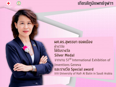 ผศ.ดร.สุพรรษา ยอดเมือง ฝ่ายวิจัย ได้รับรางวัล Silver Medal จาก งาน 51st International Exhibition of Inventions Geneva และรางวัล Special award จาก University of Hafr Al Batin in Saudi Arabia (เกียรติภูมิแพทย์จุฬาฯ)) Posted on02 เม.ย. 2026Tags#mdcu, chula, chulalongkorn, medicine, คณะแพทยศาสตร์จุฬาลงกรณ์มหาวิทยาลัย, คณะแพทยศาสตร์จุฬาฯ, คณะแพทย์จุฬาฯ, เกียรติภูมิแพทย์จุฬาฯ, แพทย์จุฬาฯ