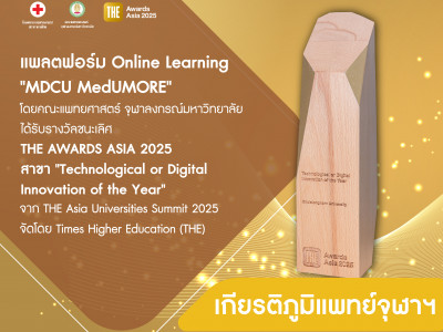 แพลตฟอร์ม Online Learning “MDCU MedUMORE” ได้รับรางวัลชนะเลิศ THE AWARDS ASIA 2025 สาขา “Technological or Digital Innovation of the Year” (เกียรติภูมิแพทย์จุฬาฯ) Posted on28 มิ.ย. 2025Tags#mdcu, chula, chulalongkorn, medicine, คณะแพทยศาสตร์จุฬาลงกรณ์มหาวิทยาลัย, คณะแพทยศาสตร์จุฬาฯ, คณะแพทย์จุฬาฯ, เกียรติภูมิแพทย์จุฬาฯ, แพทย์จุฬาฯ