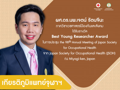ผศ.ดร.นพ.เจตน์ รัตนจีนะ ภาควิชาเวชศาสตร์ป้องกันและสังคม ได้รับรางวัล Best Young Researcher Award (เกียรติภูมิแพทย์จุฬาฯ) Posted on28 มิ.ย. 2025Tags#mdcu, chula, chulalongkorn, medicine, คณะแพทยศาสตร์จุฬาลงกรณ์มหาวิทยาลัย, คณะแพทยศาสตร์จุฬาฯ, คณะแพทย์จุฬาฯ, เกียรติภูมิแพทย์จุฬาฯ, แพทย์จุฬาฯ