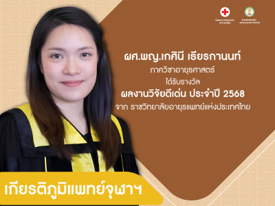 ผศ.พญ.เกศินี เธียรกานนท์ ภาควิชาอายุรศาสตร์ ได้รับรางวัลผลงานวิจัยดีเด่น ประจำปี 2568 (เกียรติภูมิแพทย์จุฬาฯ) Posted on28 มิ.ย. 2025Tags#mdcu, chula, chulalongkorn, medicine, คณะแพทยศาสตร์จุฬาลงกรณ์มหาวิทยาลัย, คณะแพทยศาสตร์จุฬาฯ, คณะแพทย์จุฬาฯ, เกียรติภูมิแพทย์จุฬาฯ, แพทย์จุฬาฯ