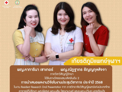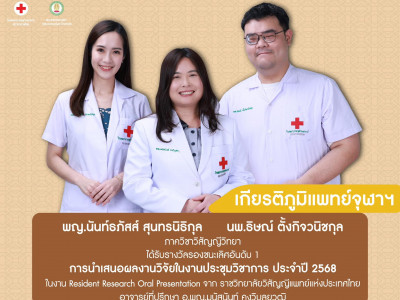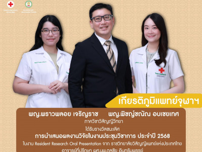 พญ.พราวพลอย เจริญราช และพญ.พิชญ์ชณัณ อบเชยเทศ ภาควิชาวิสัญญีวิทยา ได้รับรางวัลชนะเลิศ การนำเสนอผลงานวิจัยในงานประชุมวิชาการ ประจำปี 2568 ในงาน Resident Research Oral Presentation Posted on21 มิ.ย. 2025Tags#mdcu, chula, chulalongkorn, medicine, คณะแพทยศาสตร์จุฬาลงกรณ์มหาวิทยาลัย, คณะแพทยศาสตร์จุฬาฯ, คณะแพทย์จุฬาฯ, เกียรติภูมิแพทย์จุฬาฯ, แพทย์จุฬาฯ