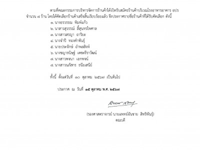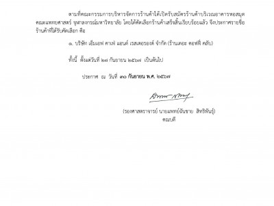 📣 ประกาศผลการคัดเลือกร้านอาหารและเครื่องดื่ม ณ บริเวณโรงอาหารอาคาร อปร คณะแพทยศาสตร์ จุฬาลงกรณ์มหาวิทยาลัย จำนวน 8 ร้าน Posted on16 ต.ค. 2024Tags#mdcu, chula, chulalongkorn, medicine, คณะแพทยศาสตร์จุฬาลงกรณ์มหาวิทยาลัย, คณะแพทยศาสตร์จุฬาฯ, คณะแพทย์จุฬาฯ, ร้านค้า, แพทย์จุฬาฯ