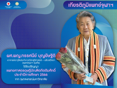 ผศ.พญ.ทรรศนีย์ บุญยัษฐิติ อาจารย์อาวุโสประจำภาควิชาสูติศาสตร์ – นรีเวชวิทยา (แพทย์จุฬาฯ รุ่นที่6) ได้รับปริญญาแพทยศาสตรดุษฎีบัณฑิตกิตติมศักดิ์ ประจำปีการศึกษา 2566 Posted on16 ต.ค. 2024Tags#mdcu, chula, chulalongkorn, medicine, คณะแพทยศาสตร์จุฬาลงกรณ์มหาวิทยาลัย, คณะแพทยศาสตร์จุฬาฯ, คณะแพทย์จุฬาฯ, เกียรติภูมิแพทย์จุฬาฯ, แพทย์จุฬาฯ