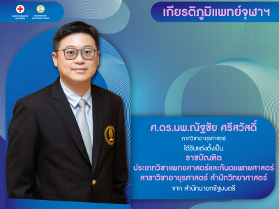 ศ.ดร.นพ.ณัฐชัย ศรีสวัสดิ์ ภาควิชาอายุรศาสตร์ ได้รับแต่งตั้งเป็นราชบัณฑิต ประเภทวิชาแพทยศาสตร์และทันตแพทยศาสตร์ สาขาวิชาอายุรศาสตร์ Posted on16 ต.ค. 2024Tags#mdcu, chula, chulalongkorn, medicine, คณะแพทยศาสตร์จุฬาลงกรณ์มหาวิทยาลัย, คณะแพทยศาสตร์จุฬาฯ, คณะแพทย์จุฬาฯ, เกียรติภูมิแพทย์จุฬาฯ, แพทย์จุฬาฯ