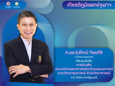 ศ.นพ.รุ่งโรจน์ ทิพยศิริ ภาควิชาอายุรศาสตร์ ได้รับแต่งตั้งเป็นราชบัณฑิต ประเภทวิชาแพทยศาสตร์และทันตแพทยศาสตร์ สาขาวิชาอายุรศาสตร์ Posted on16 ต.ค. 2024Tags#mdcu, chula, chulalongkorn, medicine, คณะแพทยศาสตร์จุฬาลงกรณ์มหาวิทยาลัย, คณะแพทยศาสตร์จุฬาฯ, คณะแพทย์จุฬาฯ, เกียรติภูมิแพทย์จุฬาฯ, แพทย์จุฬาฯ
