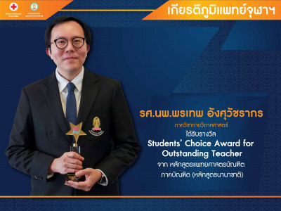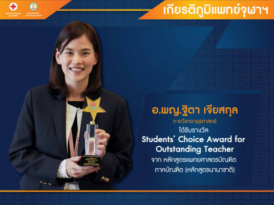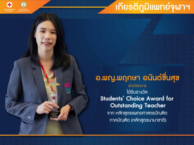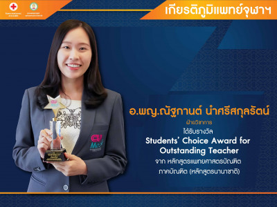 อ.พญ.ณัฐกานต์ นำศรีสกุลรัตน์ ฝ่ายวิชาการ ได้รับรางวัล Students’ Choice Award for Outstanding Teacher (เกียรติภูมิแพทย์จุฬาฯ) Posted on11 ก.ค. 2024Tags#mdcu, chula, chulalongkorn, medicine, คณะแพทยศาสตร์จุฬาลงกรณ์มหาวิทยาลัย, คณะแพทยศาสตร์จุฬาฯ, คณะแพทย์จุฬาฯ, เกียรติภูมิแพทย์จุฬาฯ, แพทย์จุฬาฯ