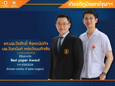 รศ.นพ.วีรศักดิ์ สิงหถนัดกิจ นพ.วันทนันท์ หล่อวัฒนกิจชัย ภาควิชาออร์โธปิดิกส์ ได้รับรางวัล Best paper Award จาก KSSS2024 (Korean society of spine surgery) (เกียรติภูมิแพทย์จุฬาฯ) Posted on11 ก.ค. 2024Tags#mdcu, chula, chulalongkorn, medicine, คณะแพทยศาสตร์จุฬาลงกรณ์มหาวิทยาลัย, คณะแพทยศาสตร์จุฬาฯ, คณะแพทย์จุฬาฯ, เกียรติภูมิแพทย์จุฬาฯ, แพทย์จุฬาฯ