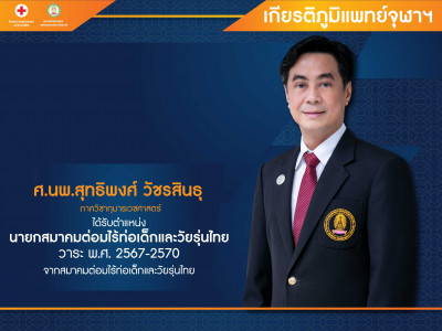 ศ.นพ.สุทธิพงศ์ วัชรสินธุ ภาควิชากุมารเวชศาสตร์ ได้รับตำแหน่งนายกสมาคมต่อมไร้ท่อเด็กและวัยรุ่นไทย วาระ พ.ศ. 2567-2570 (เกียรติภูมิแพทย์จุฬาฯ) Posted on11 ก.ค. 2024Tags#mdcu, chula, chulalongkorn, medicine, คณะแพทยศาสตร์จุฬาลงกรณ์มหาวิทยาลัย, คณะแพทยศาสตร์จุฬาฯ, คณะแพทย์จุฬาฯ, เกียรติภูมิแพทย์จุฬาฯ, แพทย์จุฬาฯ