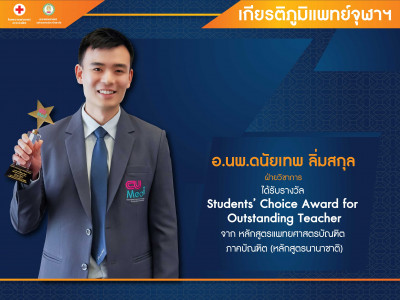 อ.นพ.ดนัยเทพ ลิ่มสกุล ฝ่ายวิชาการ ได้รับรางวัล Students’ Choice Award for Outstanding Teacher (เกียรติภูมิแพทย์จุฬาฯ) Posted on11 ก.ค. 2024Tags#mdcu, chula, chulalongkorn, medicine, คณะแพทยศาสตร์จุฬาลงกรณ์มหาวิทยาลัย, คณะแพทยศาสตร์จุฬาฯ, คณะแพทย์จุฬาฯ, เกียรติภูมิแพทย์จุฬาฯ, แพทย์จุฬาฯ