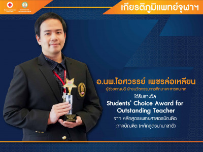 อ.นพ.ไอศวรรย์ เพชรล่อเหลียน ผู้ช่วยคณบดี ฝ่ายนวัตกรรมการศึกษาและสารสนเทศ ได้รับรางวัล Students’ Choice Award for Outstanding Teacher (เกียรติภูมิแพทย์จุฬาฯ) Posted on11 ก.ค. 2024Tags#mdcu, chula, chulalongkorn, medicine, คณะแพทยศาสตร์จุฬาลงกรณ์มหาวิทยาลัย, คณะแพทยศาสตร์จุฬาฯ, คณะแพทย์จุฬาฯ, เกียรติภูมิแพทย์จุฬาฯ, แพทย์จุฬาฯ
