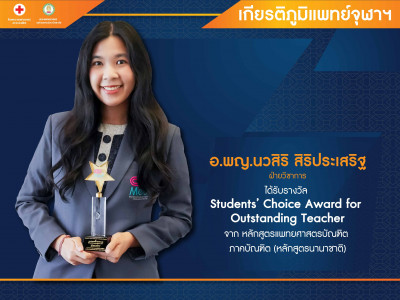 อ.พญ.นวสิริ สิริประเสริฐ ฝ่ายวิชาการได้รับรางวัล Students’ Choice Award for Outstanding Teacher (เกียรติภูมิแพทย์จุฬาฯ) Posted on11 ก.ค. 2024Tags#mdcu, chula, chulalongkorn, medicine, คณะแพทยศาสตร์จุฬาลงกรณ์มหาวิทยาลัย, คณะแพทยศาสตร์จุฬาฯ, คณะแพทย์จุฬาฯ, เกียรติภูมิแพทย์จุฬาฯ, แพทย์จุฬาฯ