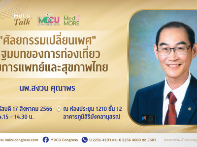 MDCU TALK 🎤✨ “ศัลยกรรมเปลี่ยนเพศ ปฐมบทของการท่องเที่ยว เชิงการแพทย์และสุขภาพไทย” โดย นพ.สงวน คุณาพร Posted on15 ส.ค. 2023Tags#mdcu, chula, chulalongkorn, MDCUCONGRESS2023, MDCUTALK, medicine, คณะแพทยศาสตร์จุฬาลงกรณ์มหาวิทยาลัย, คณะแพทยศาสตร์จุฬาฯ, คณะแพทย์จุฬาฯ, แพทย์จุฬาฯ